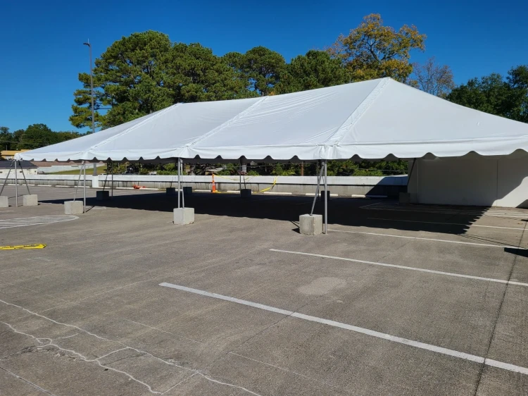 Concrete blocks are used for Frame Tents when staking is not an option.  Concrete blocks are NOT able to be used with a Pole Tent. 350 Ib. concrete blocks are used for all Frame Tents with the exception of 10'x10' and 10'x20 Frame Tents which require 150lb. concrete blocks instead.